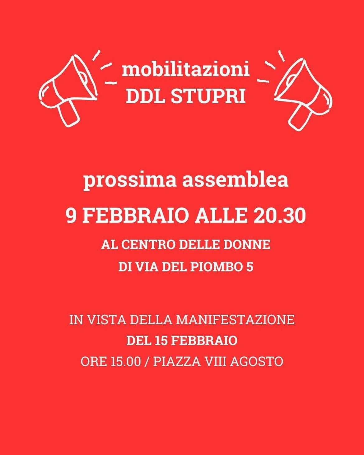 assemblea al centrodelledonnedibologna per proseguire discussione e coordinamento in vista della manifestazione del 📆 15 febbraio alle 15.00 | piazza VIII agosto. Vi aspettiamo in via del Piombo 5!