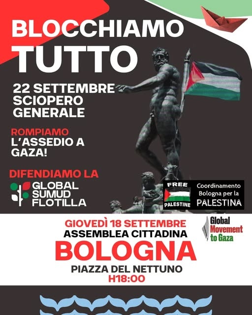 coordinamento Bologna per la Palestina aderisce allo sciopero generale, proclamato dai sindacati per lunedì 22 settembre ed è pronto a reagire in qualsiasi momento in caso di aggressione alla Global Sumud Flotilla.