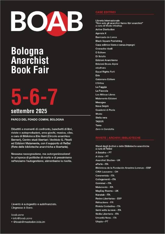 Dibattiti e momenti di confronto, banchetti di libri, riviste e autoproduzioni, area giochi, musica, cibo, a cura di Biblioteca Elio Xerri (Circolo anarchico Berneri), Centro studi libertari G. Pinelli ed edizioni Malamente, con il supporto di ReBal (Rete delle biblioteche anarchiche e libertarie).