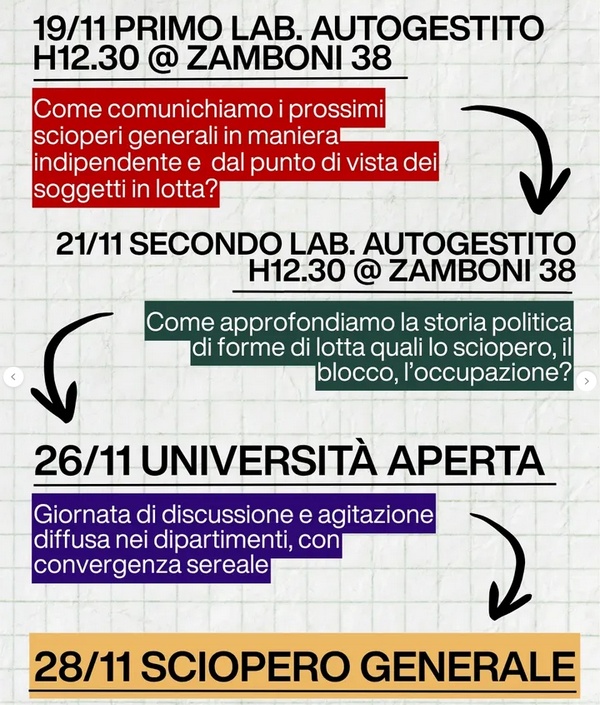 A partire dal 14 novembre, giornata di sciopero studentesco e di contestazione alla presenza dei ministri della guerra in città, si è condivisa l’esigenza di costruire una processualità verso lo sciopero generale del 28 novembre, intrecciando le diverse pratiche e i differenti contesti di lotta.