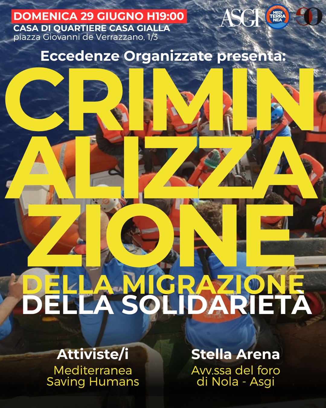 Per analizzare e riflettere su come questa duplice criminalizzazione delle persone in transito e delle reti di solidarietà si produce e riproduce, per prefigurare assieme strategie di rottura di questo dispositivo, abbiamo invitato a discutere con noi: Stella Arena, avvocatessa del foro di Nola e collaboratrice dell'Associazione di Studi Giuridici sull'Immigrazione (ASGI) che si occupa di difendere coloro che sono accusati di essere scafisti; attiviste e attivisti di Mediterranea Saving Humans.