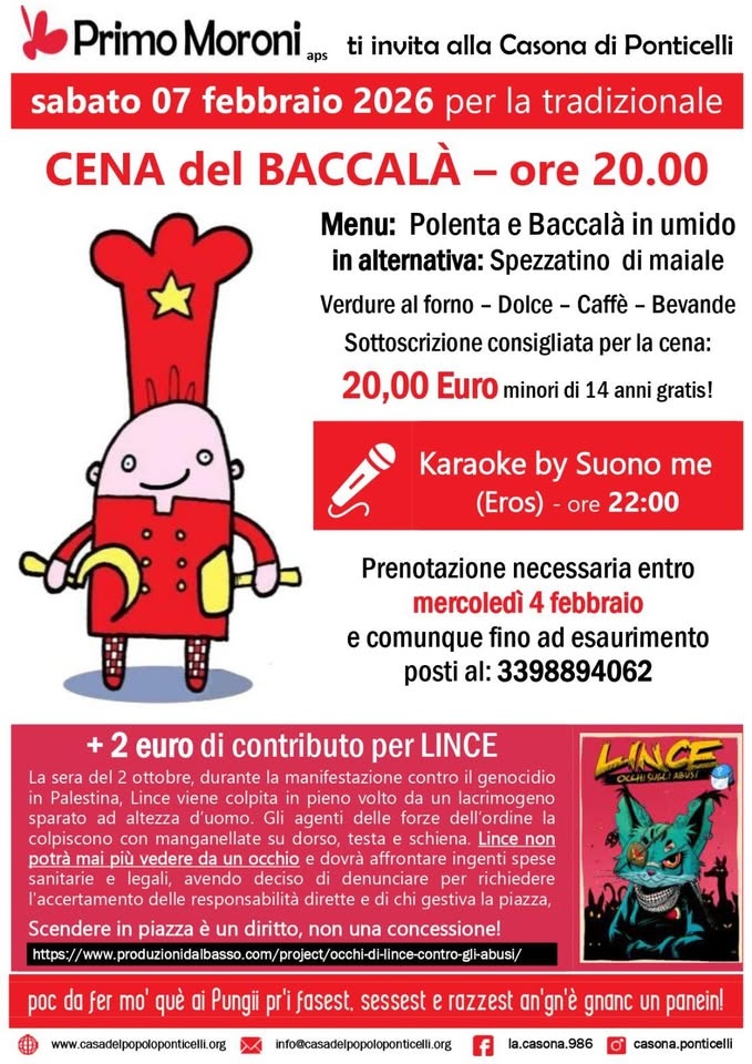 La sottoscrizione consigliata per la cena: 20,00 Euro