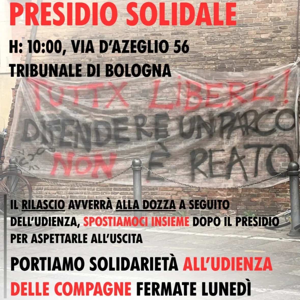 Dopo l'udienza le compagne saranno ricondotte al carcere della Dozza per recuperare i loro effetti personali. Ci sposteremo tutte insieme dal tribunale al carcere della Dozza (via del Gomito 2) per aspettarle all'uscita direttamente dopo il presidio in tribunale