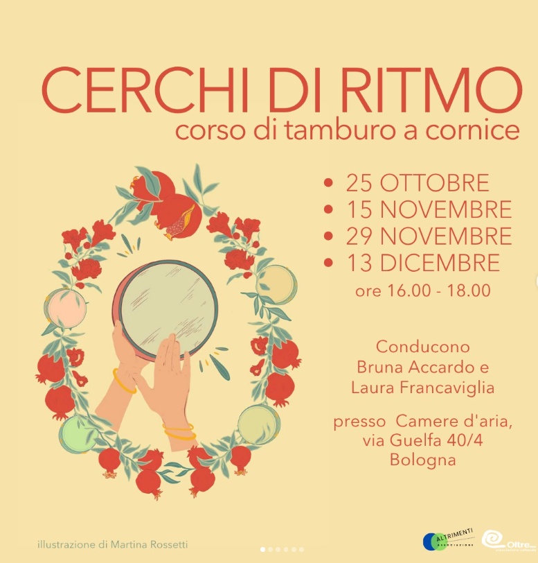 Nel progetto "Cerchi di ritmo" esploreremo la pratica del tamburo a cornice attraverso una ricerca teorica, simbolica, archetipica oltre che tecnica. All'interno del percorso verranno anche proposti incontri di danza e canto collettivi.
