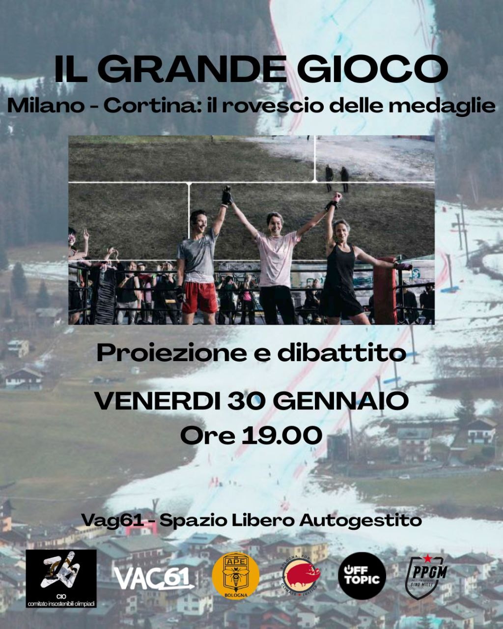Prosegue la rassegna di incontri, proiezioni e dibattiti al Vag61: vi aspettiamo venerdì 30 gennaio per la proiezione di “Il Grande Gioco. Milano-Cortina: il rovescio delle medaglie”, documentario critico sulle Olimpiadi Milano-Cortina 2026, a cura del Comitato Insostenibili Olimpiadi e del laboratorio Off Topic.