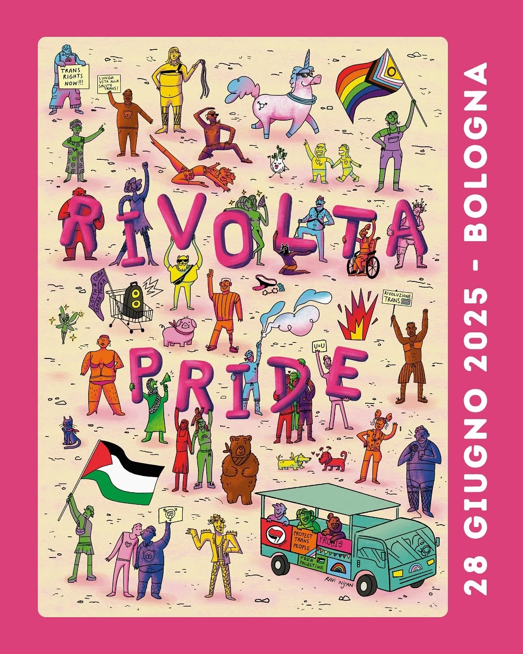 Quello del Rivolta Pride è un percorso politico autogestito e creato dal basso, al fine di avere un Pride cittadino a Bologna che raccolga tutte le anime, le complessità, i desideri e le rivendicazioni di realtà informali, associazioni e singole che quotidianamente, attraverso diversi mezzi e strumenti, combattono l’omolesbobitransafobia, la misoginia, il razzismo, l’abilismo, la giustizia climatica e la povertà!