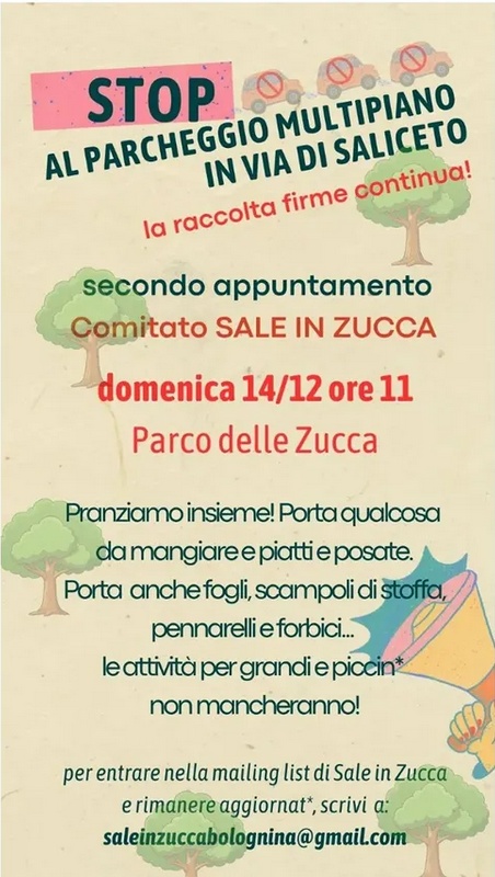 Domenica 14 socialità, musica, cibo e giochi per dire no al progetto del parcheggio, inutile, dannoso per la salute e per la qualità della vita, e fortemente impattante, in una zona cittadina già oggetto di una cementificazione selvaggia.