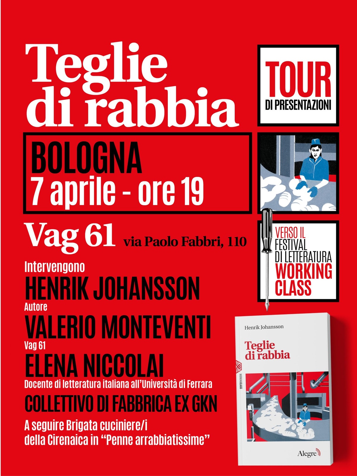 Henrik Johansson, sarà in tour con le sue “Teglie di rabbia” dal 2 al 15 aprile, passando da Pisa, Bologna, Reggio Emilia, Genova e Livorno. E il 12 aprile sarà al Festival di letteratura working class a Campi Bisenzio (Fi).