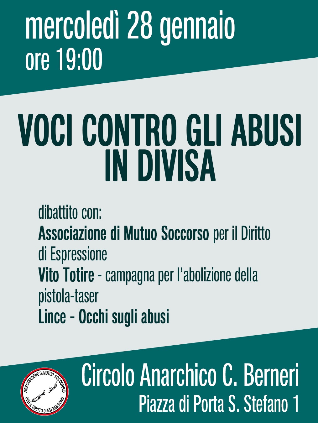 Una serata in cui approfondire due percorsi che denunciano gli abusi in divisa: la campagna di Lince - occhi sugli abusi e il comitato per l’abolizione della pistola taser.