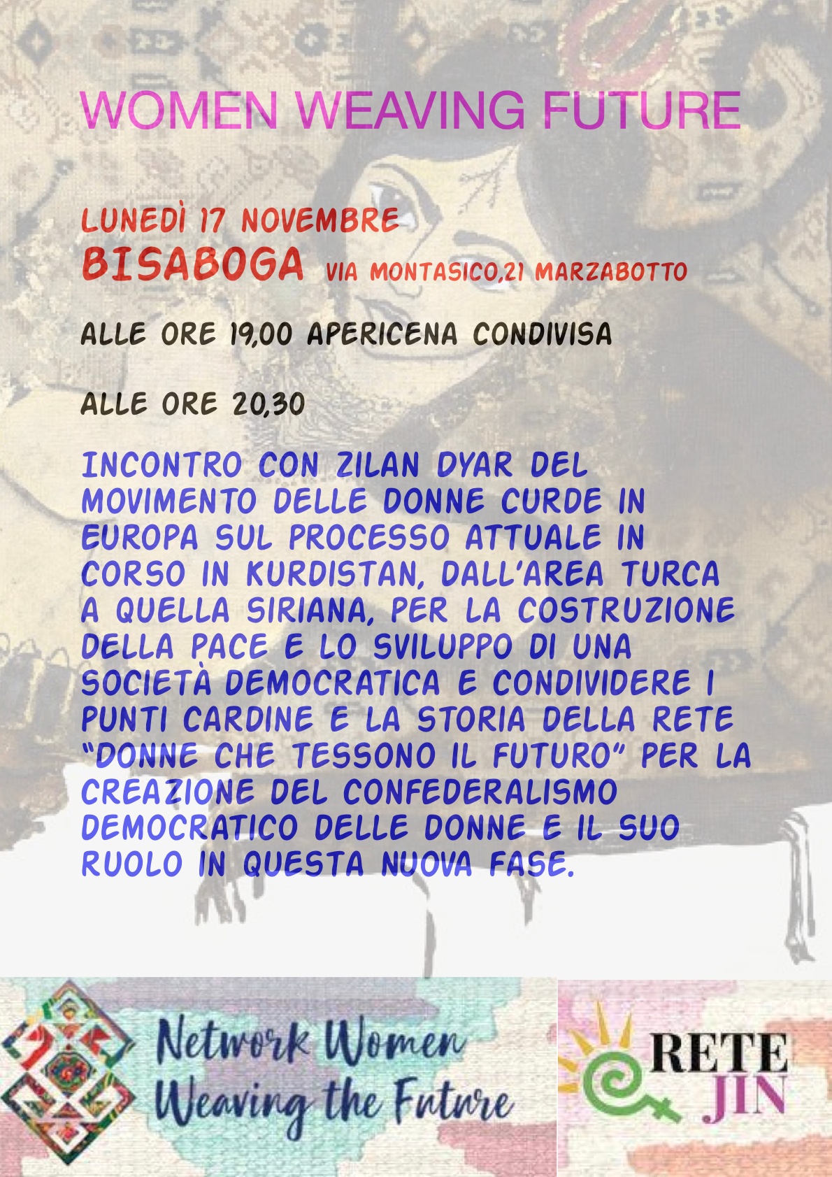 Vogliamo con questo incontro fare luce sul processo attuale in corso in Kurdistan, dall’area turca a quella siriana, per la costruzione della pace e lo sviluppo di una società democratica e condividere i punti cardine e la storia della rete “Donne che tessono il futuro” per la creazione del confederalismo democratico delle donne e il suo ruolo in questa nuova fase.