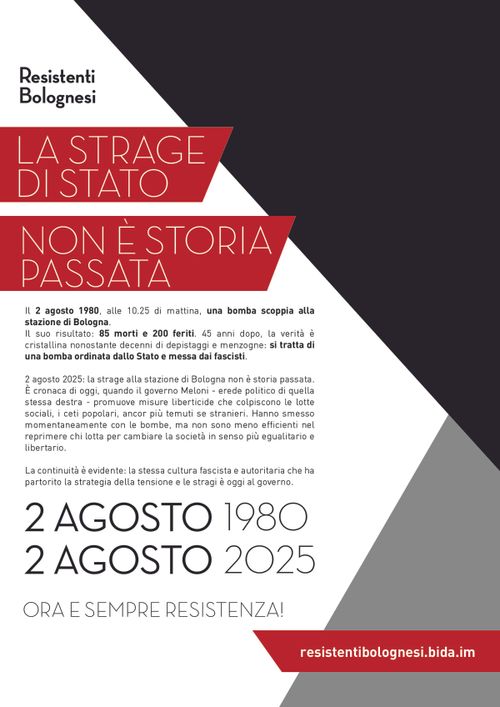 La strage di Stato non è storia passata Saturday, Aug 02, 08:30 AM Piazza del Nettuno Piazza del Nettuno, Bologna corteomemoriastrage di bolognastragedistato
