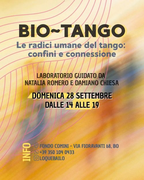Biotango laboratorio Sunday, Sep 28, 02:00 PM-07:00 PM Sunday 28 September 19:00 Casa di Quartiere Fondo Comini 68, Via Aristotile Fioravanti, Arcoveggio, Navile, Bologna, Emilia-Romagna, 40129, Italia biodanzalaboratoriotangoworkshop